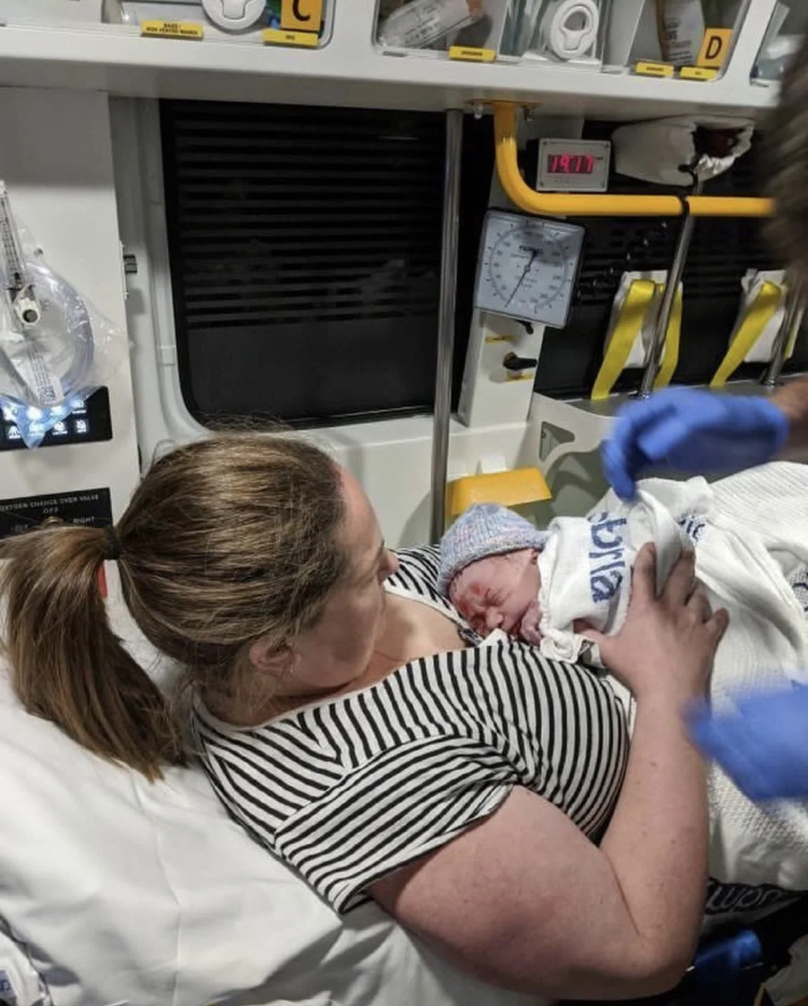 She told dad to wrap you up in towels and keep you warm on my chest. She then asked if you were a boy or a girl – dad looked and proudly said boy! I didn’t believe him and asked him again. Your pop walked in about 2 minutes after you were born to look after Poppy and the ambulance arrived 5 minutes after that (19:07). The ambulance officer James checked us both over and got a little beanie for you to keep your head warm. We had to keep the placenta and umbilical cord attached until we got to the hospital. Mum had to keep reminding people to go slow when getting up onto the stretcher that we were still attached via the umbilical cord!